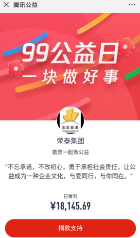 9月5日至15日,為加強(qiáng)企業(yè)文化建設(shè),奉獻(xiàn)榮泰人的愛心,建設(shè)“仁者愛人、與人為善”的富有人文關(guān)懷的慈善愛心企業(yè),激勵榮泰人以慈善為本,以榮泰人為榮,實現(xiàn)企業(yè)同發(fā)展、共雙贏的情懷,集團(tuán)積極參與“騰訊公益慈善基金會”聯(lián)合舉辦的“99公益日一塊做好事,榮泰集團(tuán)慈善一起捐”活動。