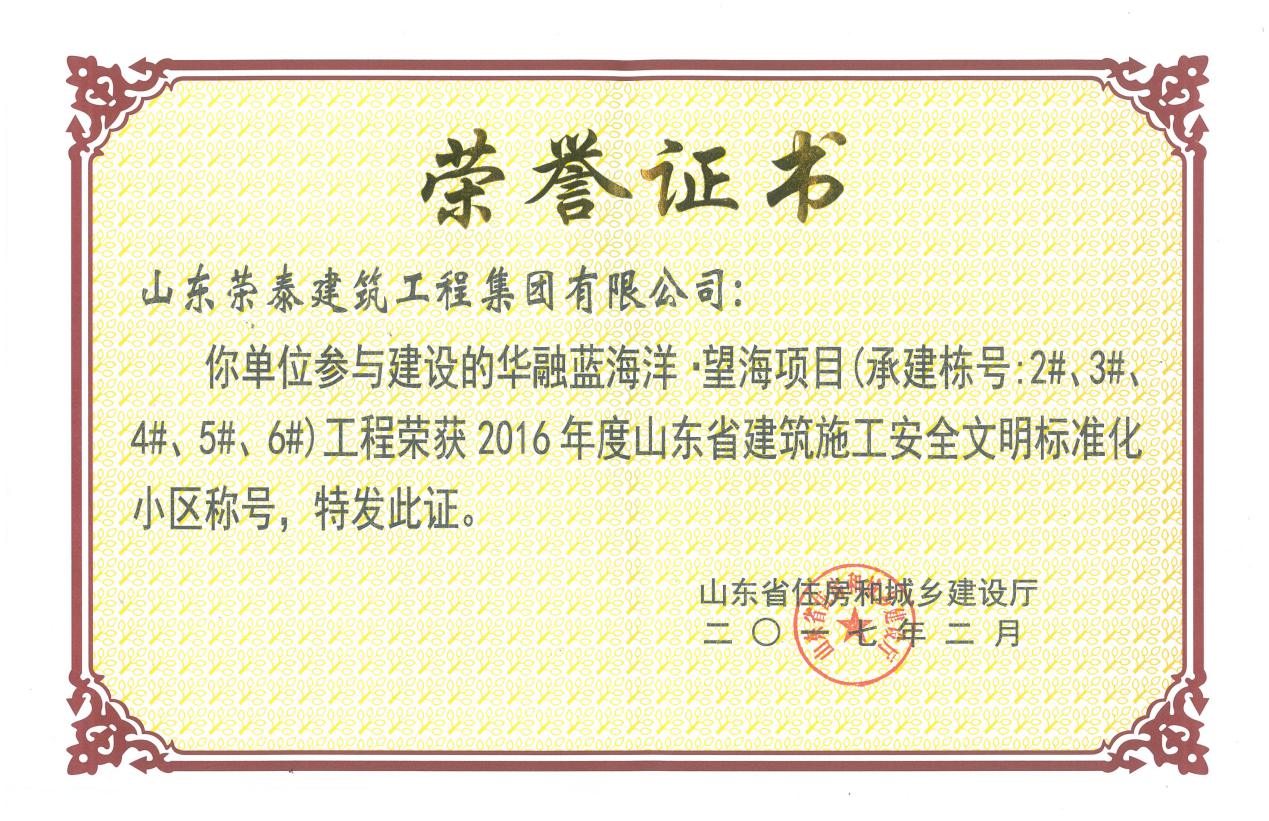 由山東榮泰建筑工程集團(tuán)有限公司承建的青島海岸路2號住宅工程(華融藍(lán)海洋)二期三期項目、鑫海錦園5-9#樓及地下車庫、智能工業(yè)機(jī)器人技術(shù)研發(fā)科技樓項目、青島林海建設(shè)工程有限公司承建的鑫海錦園1-4#樓10-12#樓幼兒園項目喜獲2016年度“山東省建筑施工安全文明標(biāo)準(zhǔn)化小區(qū)”、“山東省建筑施工安全文明標(biāo)準(zhǔn)化優(yōu)良工地”。